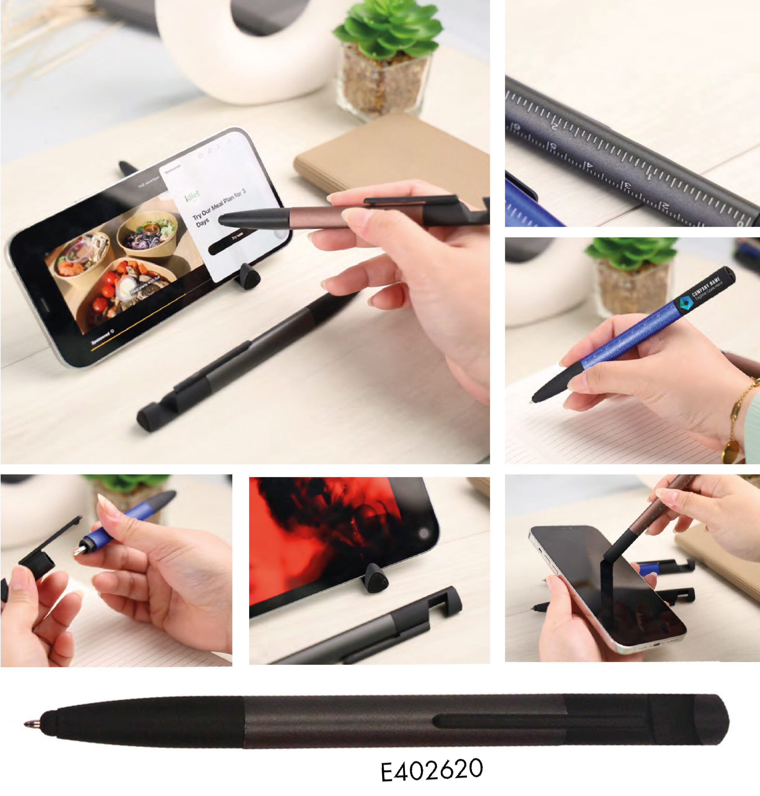Multi-funtional twist ball pen made from aluminum material in which can also be used as touch pen, ruler, screen cleaner, phone holder and as a screwdriver.