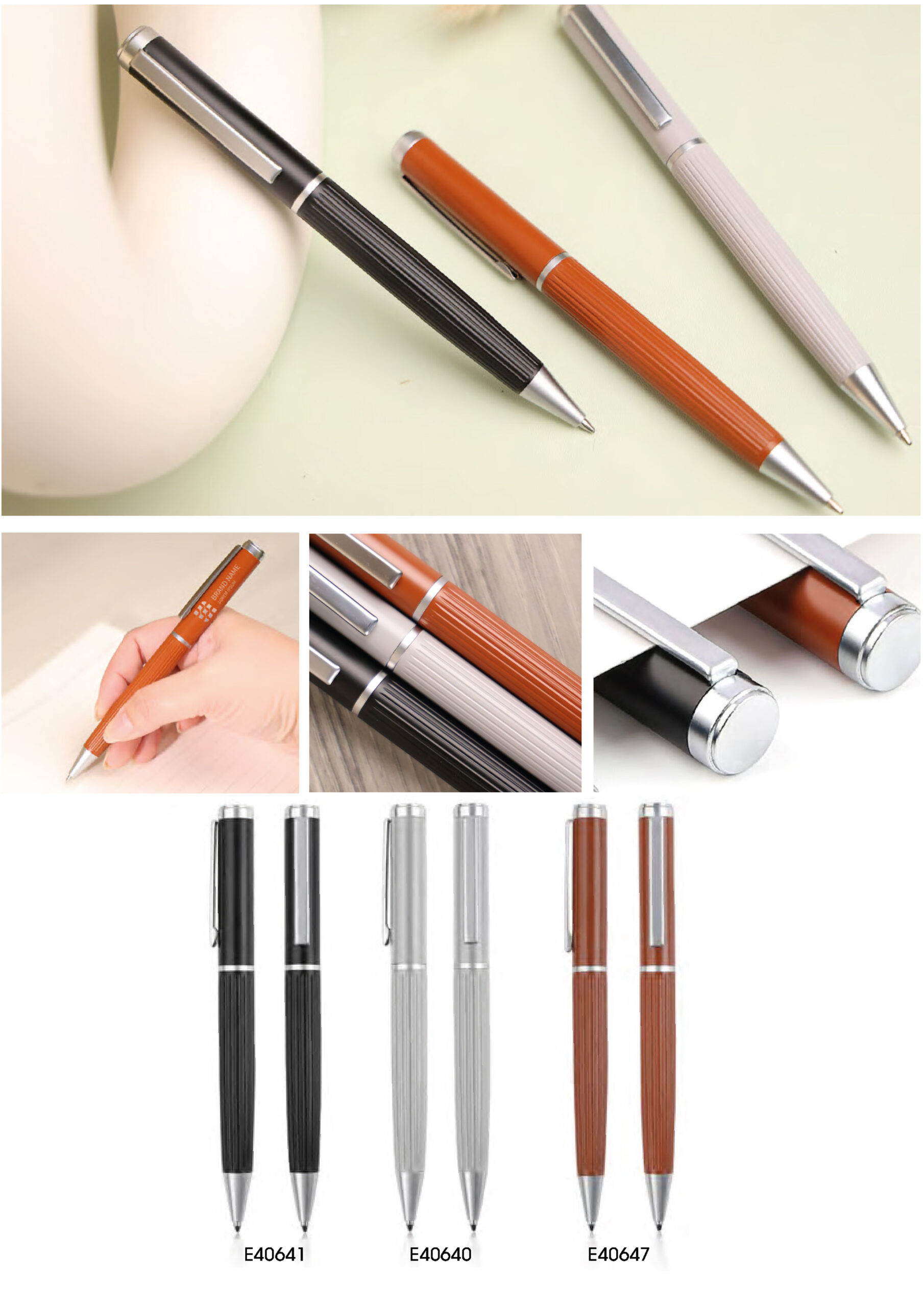 Metal pen with corrugated design on the body.