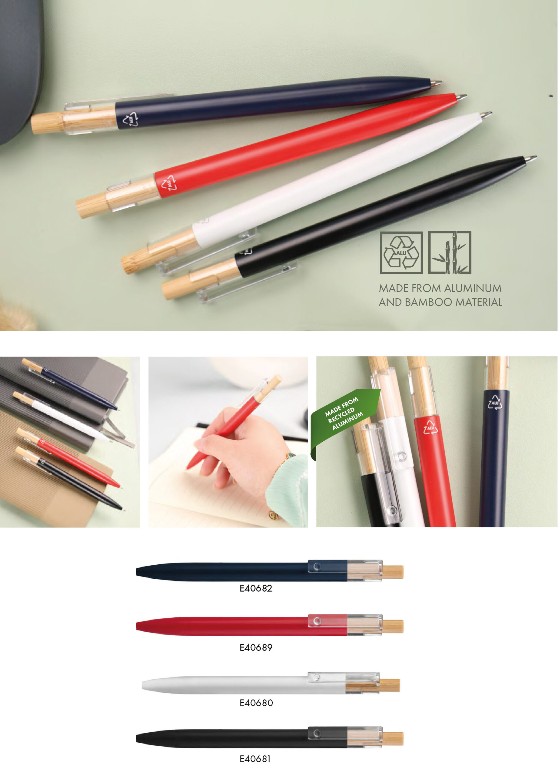 Eco Innovative pen is crafted with recycled aluminum, eco-conscious recycled ABS, and FSC-certified bamboo.