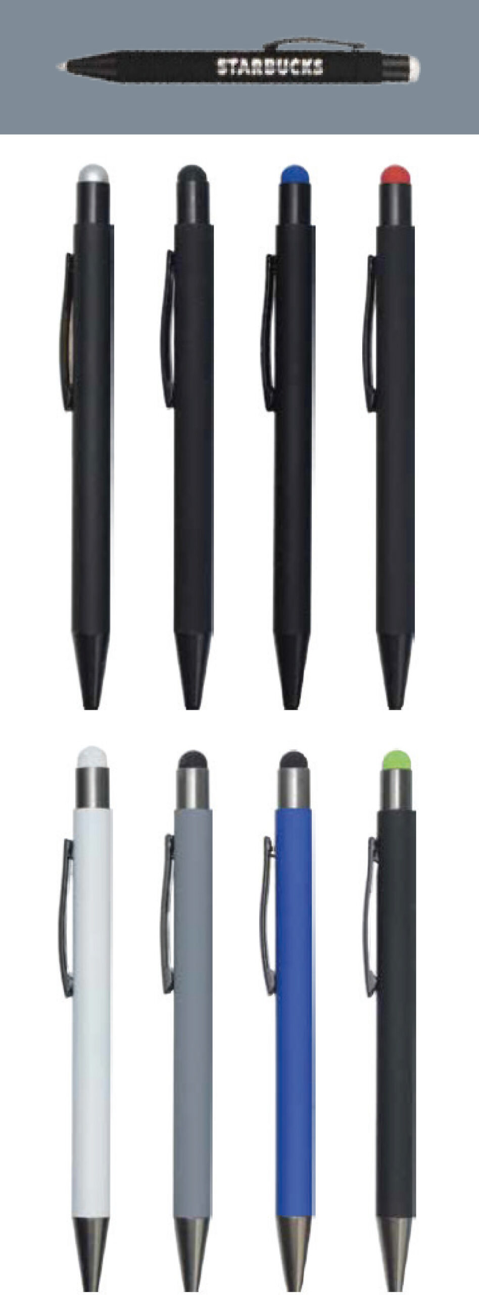 Metal Pen with Stylus. Made from tough metal with a soft rubberized coating 2-in-1 pen functions as both a writing tool and a stylus for touchscreens.