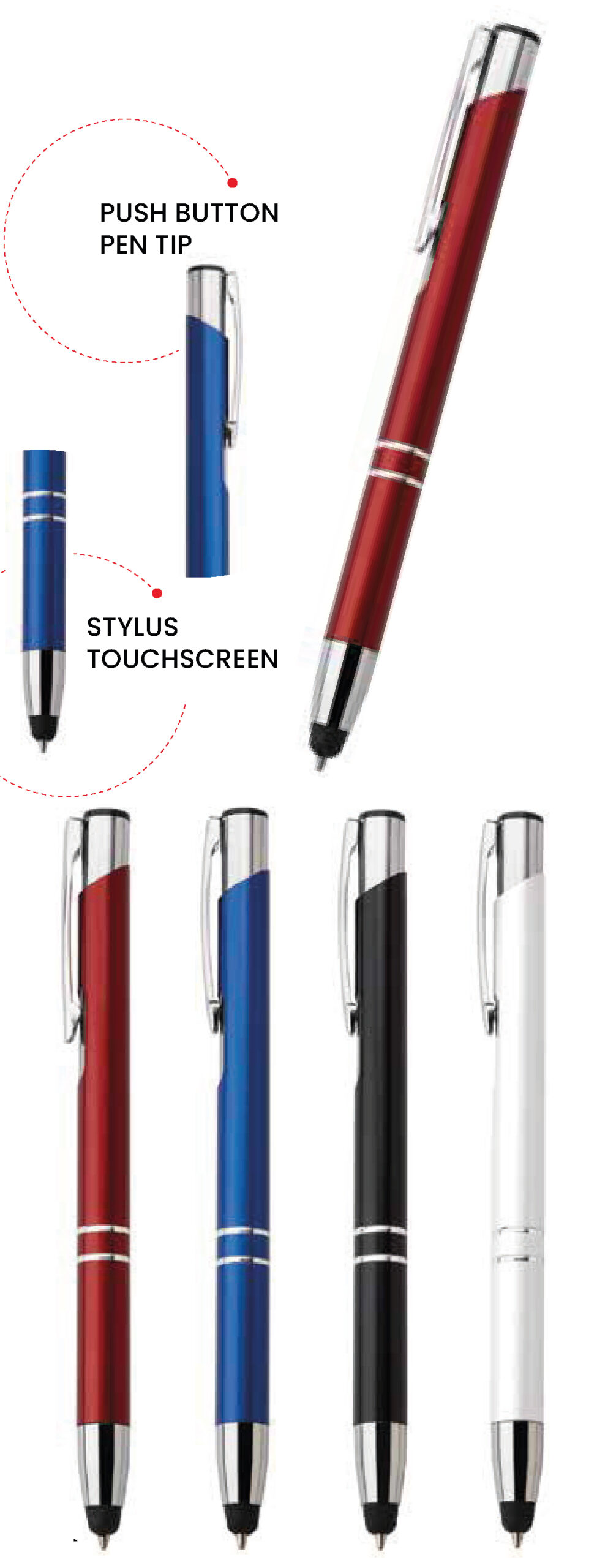 Aluminum stylus with touch tip for touch screens and metal clip, retractable opening system, excellent glossy finish Smooth writing Blue Refill.