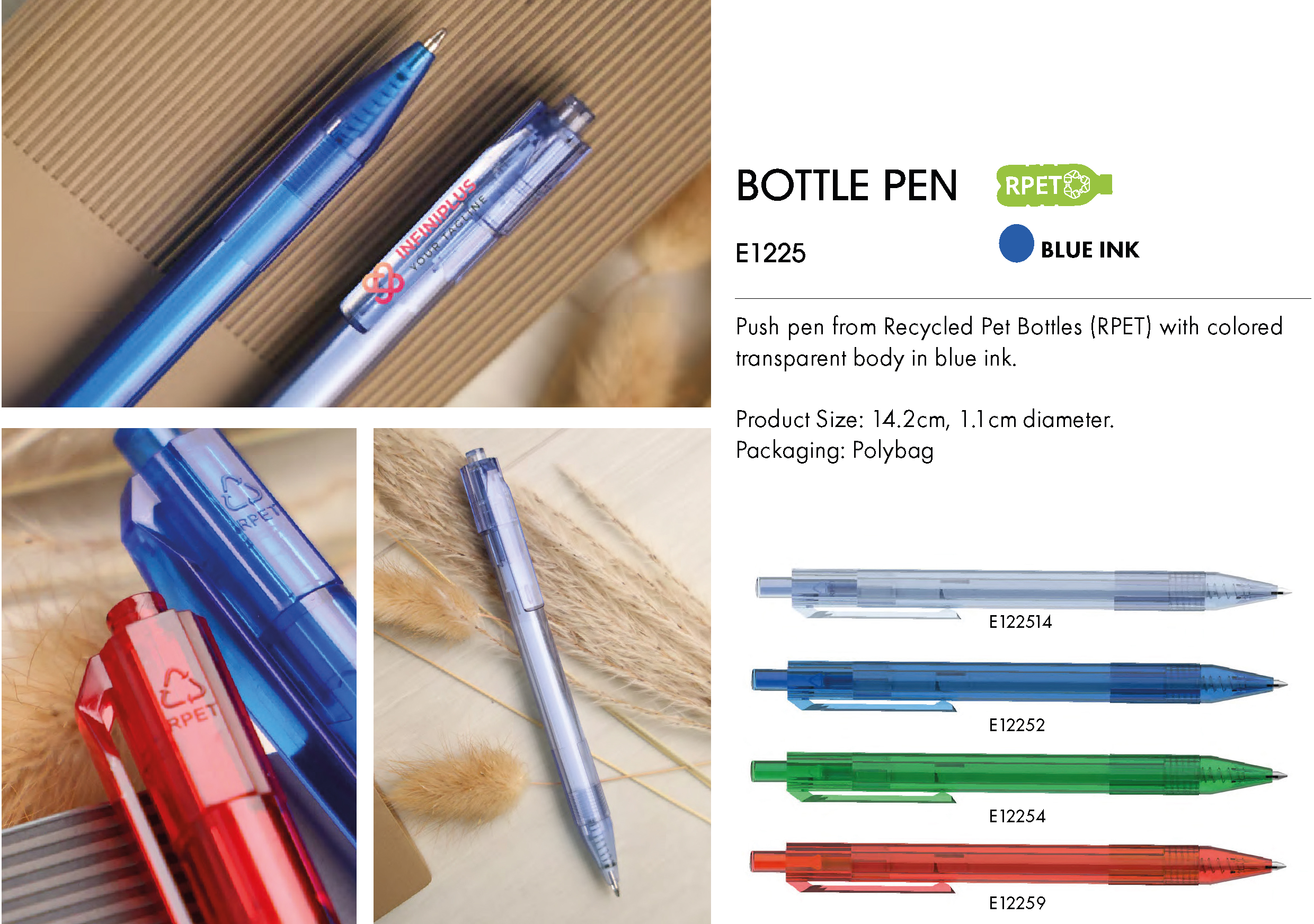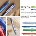 Push pen from Recycled Pet Bottles (RPET) with colored transparent body in blue ink.