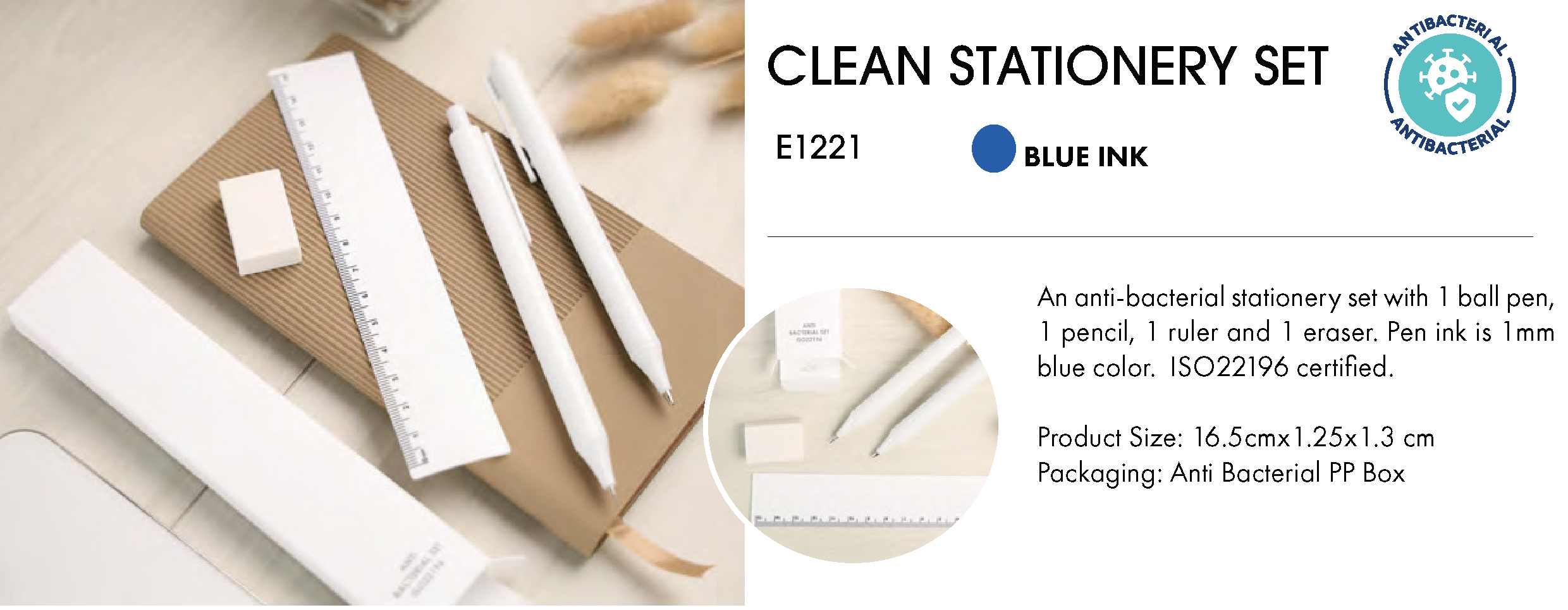 An anti-bacterial stationery set with 1 ball pen, 1 pencil, 1 ruler and 1 eraser. Pen ink is 1mm blue color. ISO22196 certified.