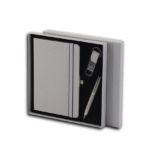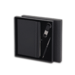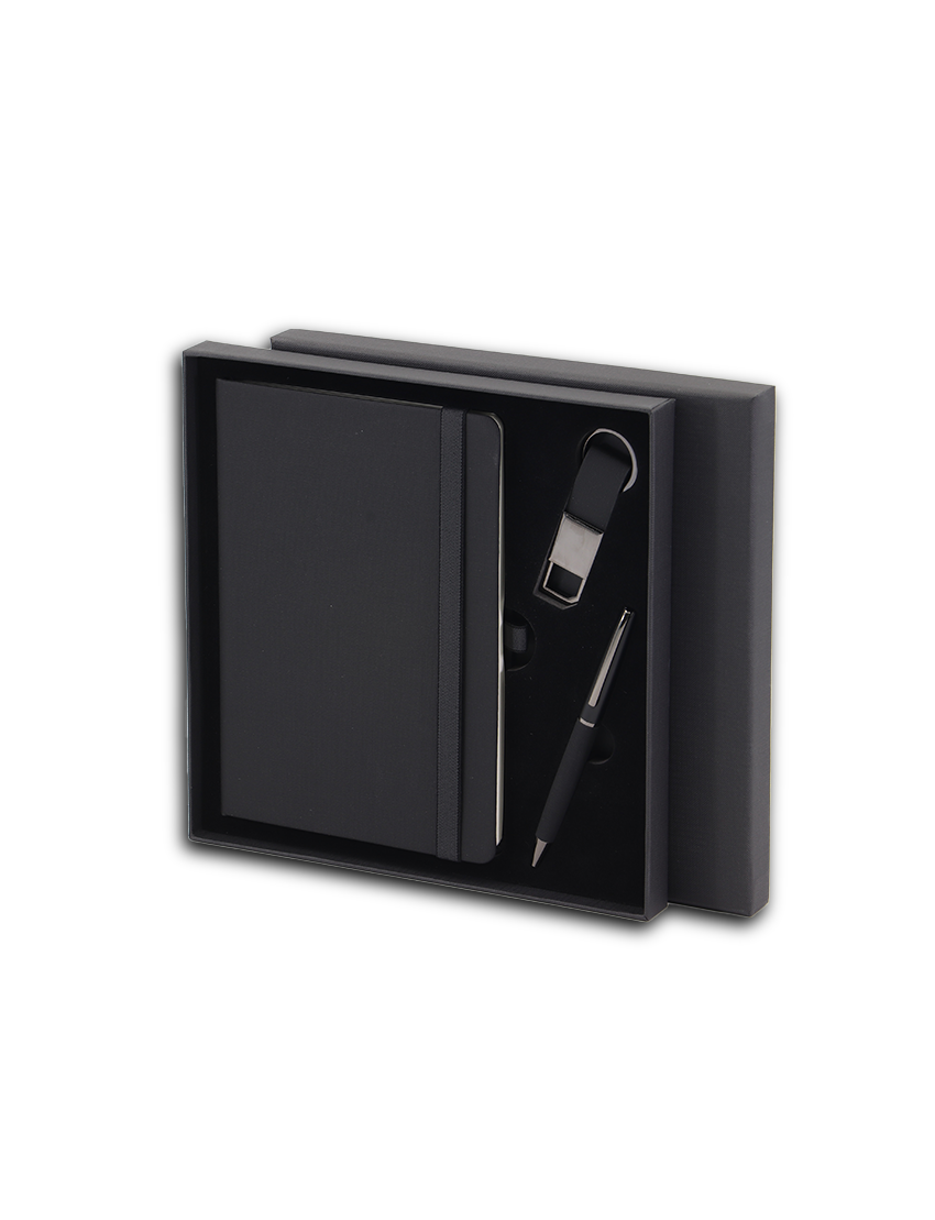 The perfect gift for any occasion! This sophisticated set features a beautifully crafted A5 notebook made from special PU material, containing 96 sheets of 70g ruled ivory paper for a smooth writing experience. The notebook includes a convenient pen loop to keep your writing instrument handy at all times.Accompanying the notebook is a sleek metal pen with a PU cover on the barrel and an eye-catching spray paint finish on the clip side, ensuring both style and functionality. Additionally, the set includes a stylish keychain made from PU material, featuring an electroplated gunmetal holder that adds a touch of elegance.All components are elegantly packaged in a matching color hard paper box, making the PRIME SET an ideal gift for colleagues, friends, or loved ones. With dimensions of 24 x 24 x 2.5 cm, this set is perfectly sized for easy gifting and storage.