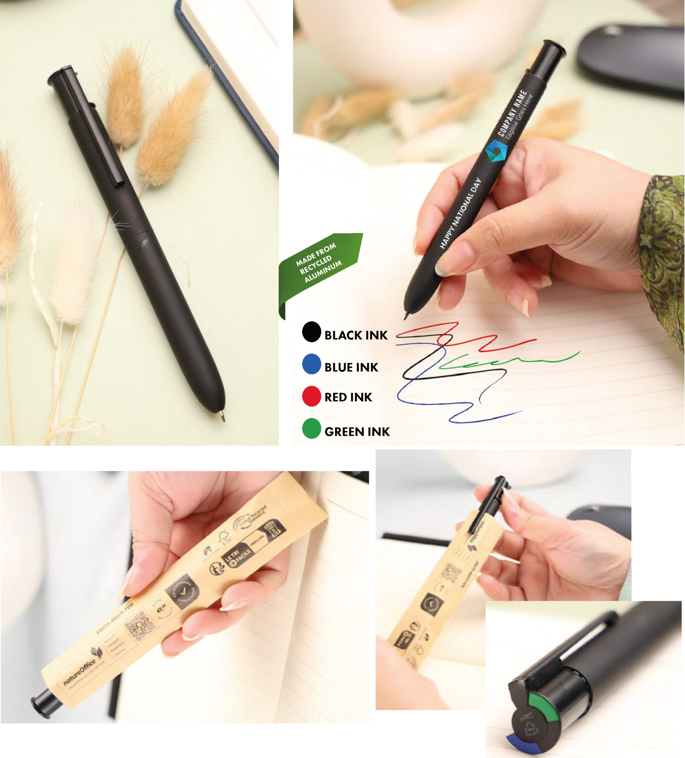 4-color ball pen, made of recycled aluminum, is a sleek and stylish writing instrument that combines elegance and functionality. Has a German ink with colors : black, blue, red, and green. With mirror finish effect barrel.