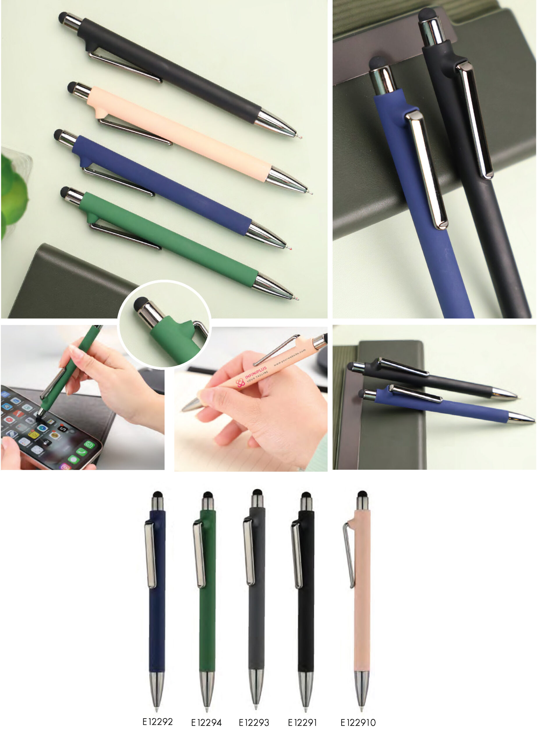 Rubberized barrel with UV grey tip, clip and pusher stylus. Has semi-gel ink refill.